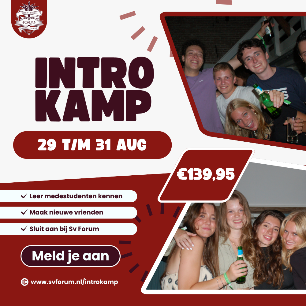 Van 29 t/m 31 augustus 2025 vindt het introkamp plaats. Hier leer je je nieuwe medestudenten en de vereniging beter kennen. En maak je geen zorgen, het is geen ontgroening. Tijdens het introkamp draait alles om plezier en kennismaking. Het weekend kost €139.95. Eten en drinken (m.u.v. bier), de activiteiten en groot deel van het vervoer is inbegrepen.