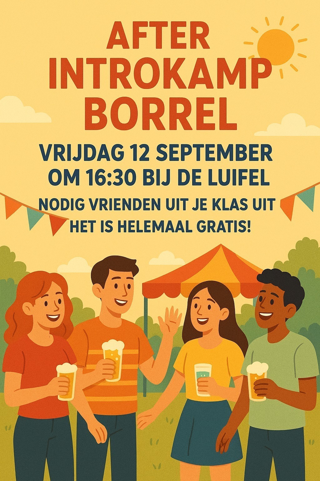 Vrijdag 12 september nodigen we je uit voor de After Intro Borrel bij de Luifel. Vanaf 16:30 knallen we samen het weekend in met gezelligheid, muziek en natuurlijk een drankje in je hand. Dit is de perfecte gelegenheid om elkaar weer te zien na het introkamp + het eerste biertje op ons. Dus: nodig je klasgenoten uit, kom gezellig langs en maak er samen met ons een topmiddag van!