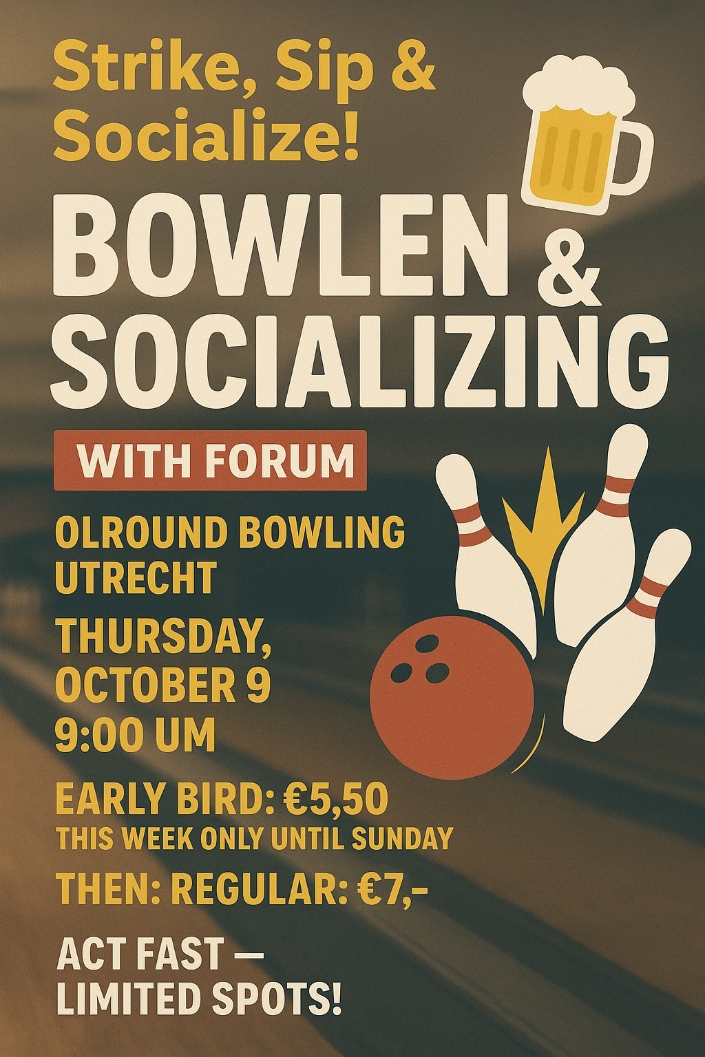 Op donderdag 9 oktober om 20:00 gaan we bowlen en borrelen bij Olround Bowling. Op deze activiteit gaan we een balletje gooien, maar daarnaast krijg je ook nog eens het eerste drankje gratis! Meldt je dus snel aan en dan zien we jullie daar!