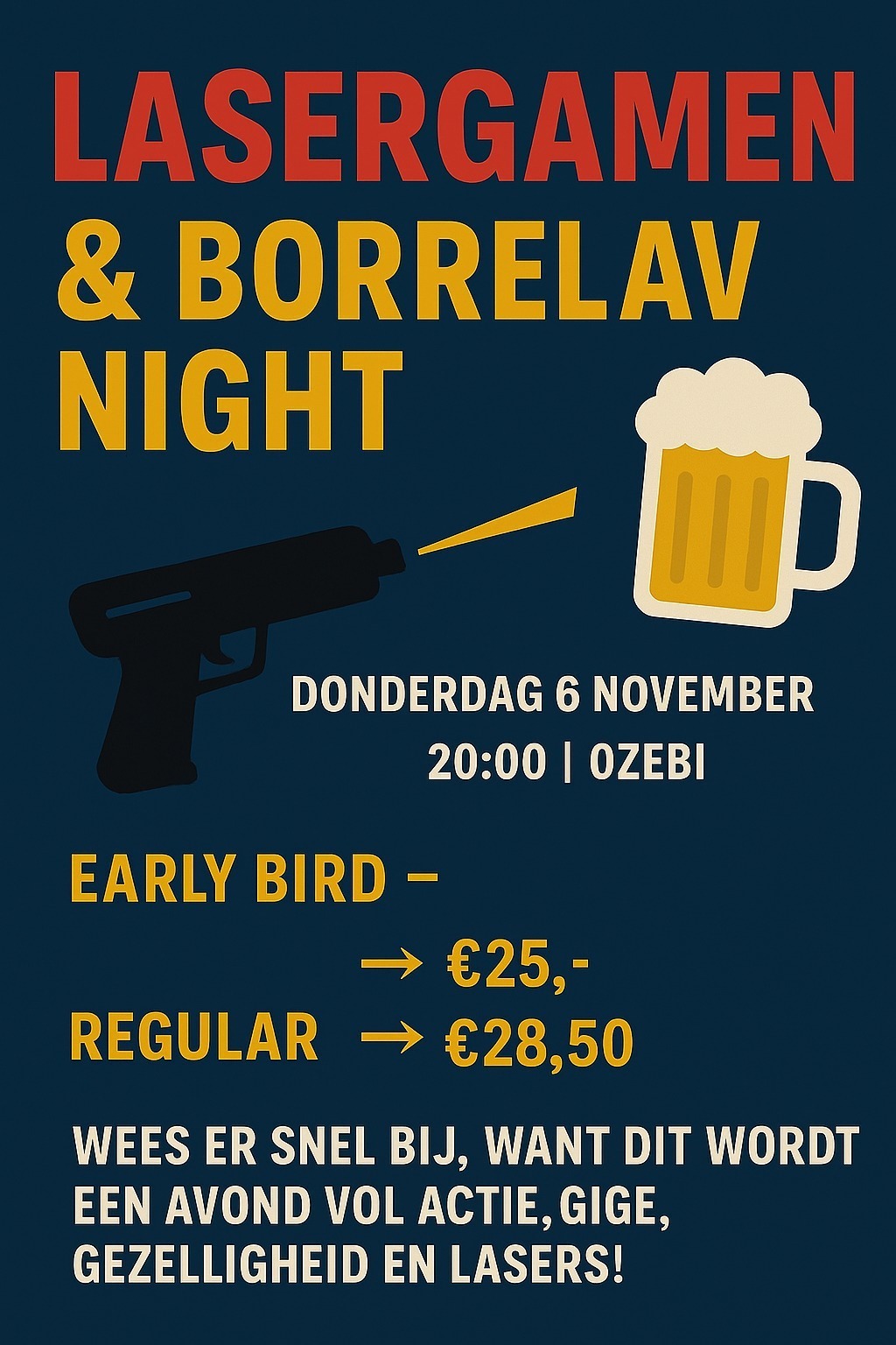 op donderdag 6 november om 20:00 gaan we lasergamen en borrelen bij Ozebi! Deze borrel avond is met bijna anderhalf uur open bar!